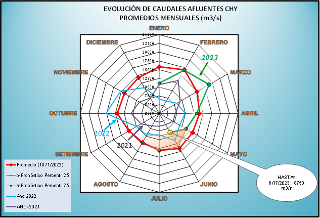El caudal afluente a la CHY diario, pronosticado para la fecha de hoy es de 11.300 m3/s, y para el día de mañana se espera una afluencia del orden de 10.600 m3/s.