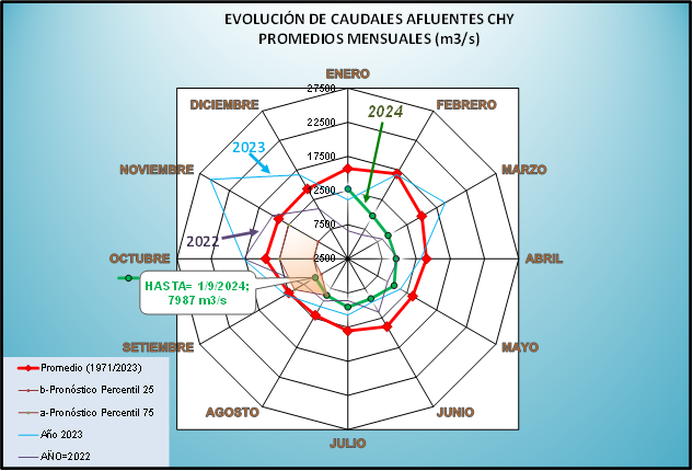 El caudal afluente a la CHY diario, pronosticado para la fecha de hoy es de 7.800 m3/s, y para el día de mañana se espera una afluencia del orden de 7.800 m3/s.