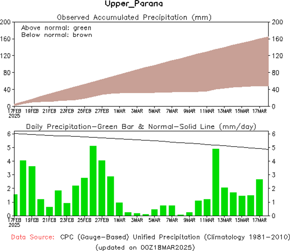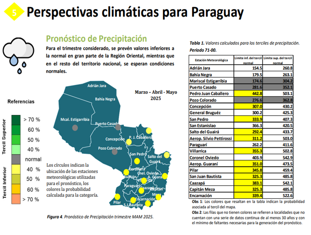 Para el trimestre considerado, se prevén valores infeiores a la normal en gran parte de la región oriental, mientras que en el resto del territorio nacional, se esperan condiciones normales.