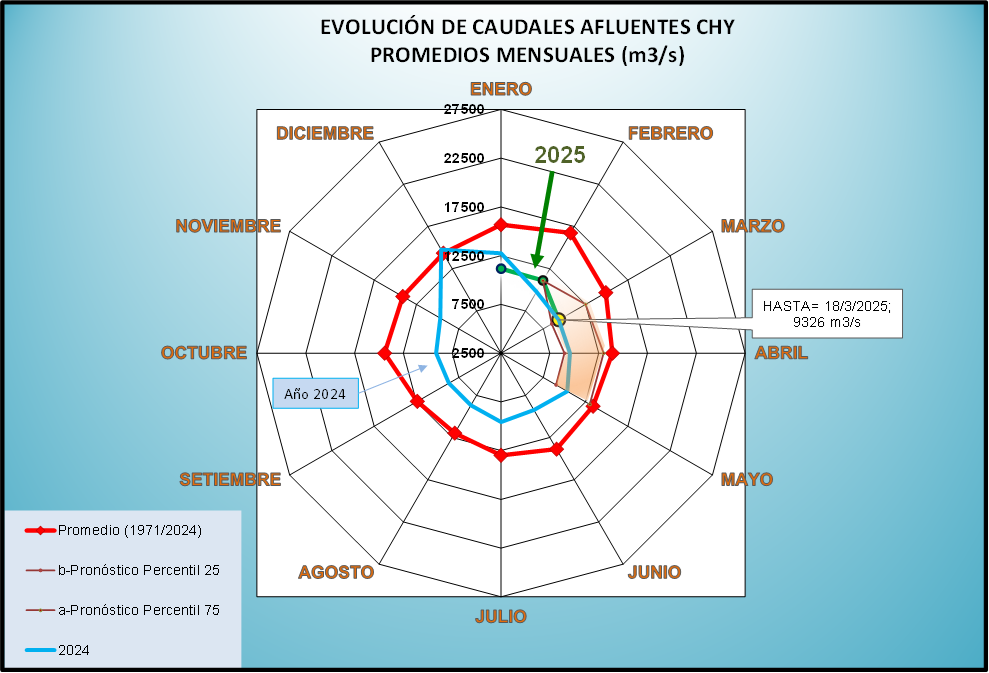 El caudal afluente a la CHY diario, pronosticado para la fecha de hoy es de 8.800 m3/s, y para el día de mañana se espera una afluencia del orden de 9.300 m3/s.