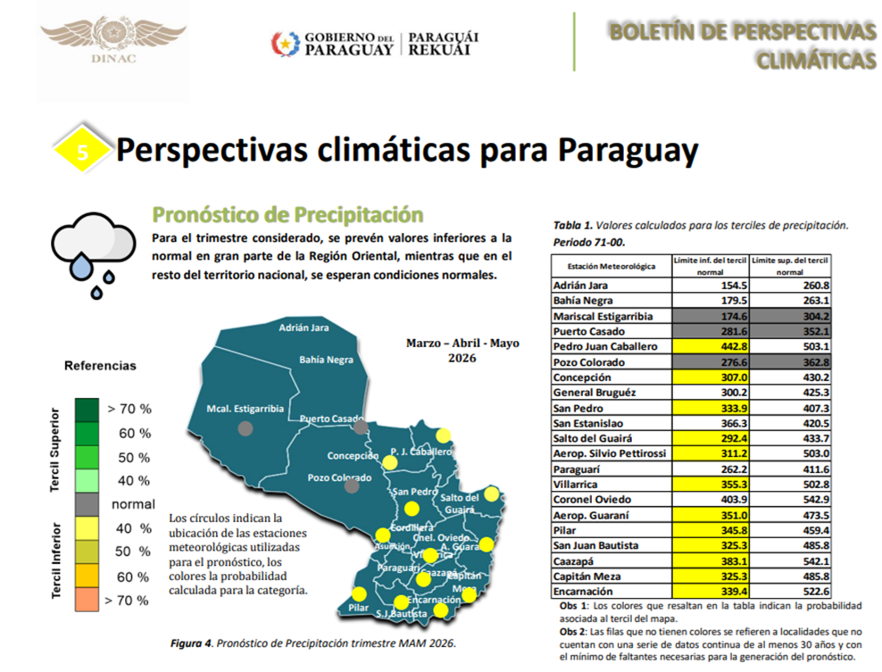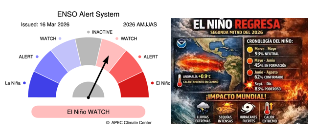 • El fenómeno de La Niña de 2025-2026 está llegando a su fin. Las temperaturas de la superficie del mar en el Pacífico tropical central han superado el umbral de La Niña (−0,80 °C) durante las últimas cuatro semanas, registrándose el último valor relativo del índice Niño3.4 para la semana que finalizó el 15 de marzo de 2026 en -0,53 °C. El calentamiento en las capas subsuperficiales sugiere que es probable que el fenómeno continúe disminuyendo en las próximas semanas.