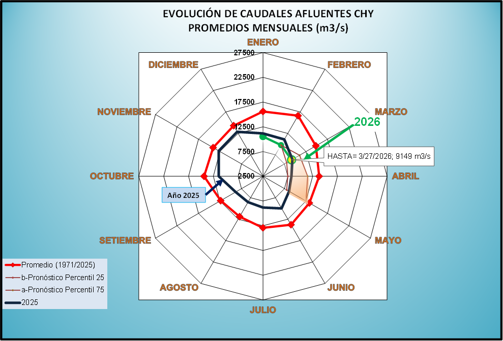 El caudal afluente a la CHY diario, pronosticado para la fecha de hoy es de 11.000 m3/s, y para el día de mañana se espera una afluencia del orden de 10.500 m3/s.