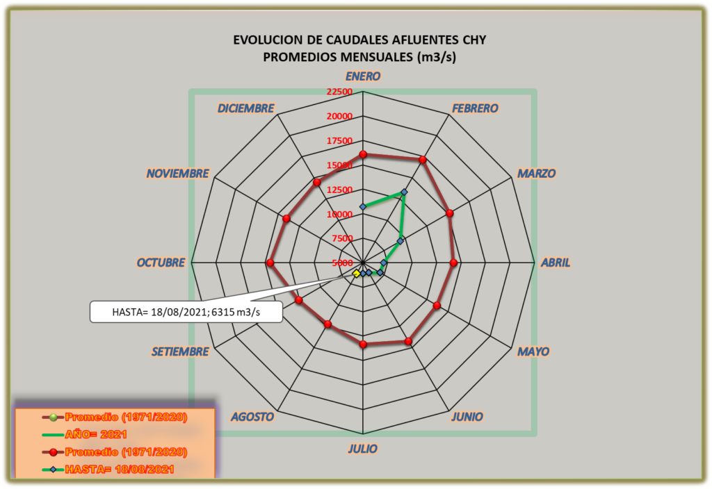 El caudal afluente a la CHY diario, pronosticado para la fecha de hoy es de 6.700 m3/s, y para el día de mañana se espera una afluencia del orden de 6.900 m3/s.