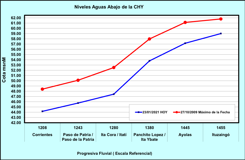 El caudal afluente a la CHY diario, pronosticado para la fecha de hoy es de 12.800 m3/s, y para el día de mañana se espera una afluencia del orden de 13.800 m3/s.