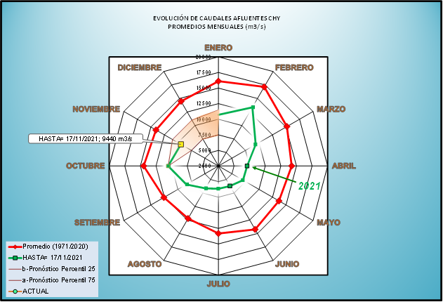 El caudal afluente a la CHY diario, pronosticado para la fecha de hoy es de 8.400 m3/s, y para el día de mañana se espera una afluencia del orden de 8.400 m3/s.