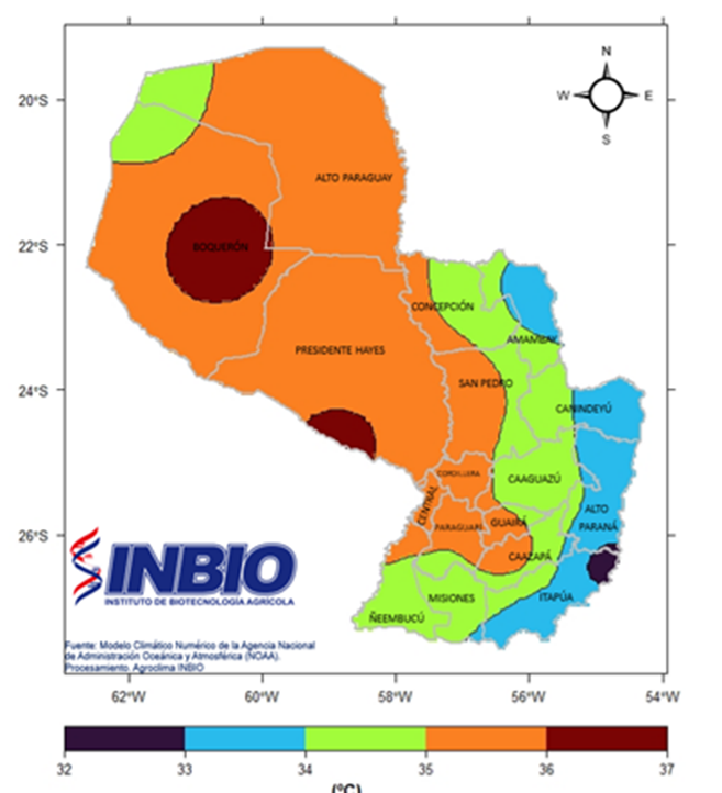 En los próximos días, se estima que los registros de la temperatura máxima extrema llegarían a los 37 °C, estos registros térmicos serán sectorizados sobre algunas áreas en el Bajo Chaco, como también en algunos núcleos en el Chaco Central.