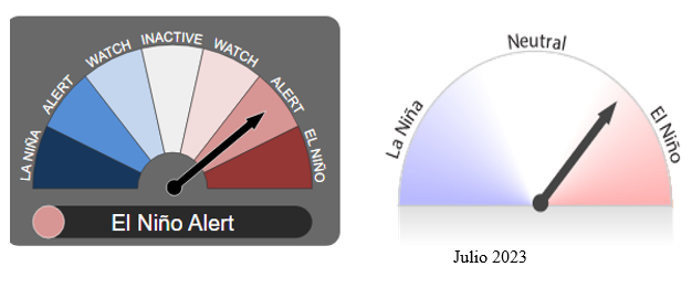 La Perspectiva ENSO está en Alerta El Niño. Cuando los criterios de Alerta de El Niño se han cumplido en el pasado, un evento de El Niño se ha desarrollado alrededor del 70% del tiempo.