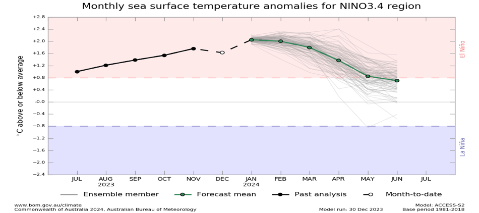 Los indicadores oceánicos muestran firmemente un estado de El Niño. Las temperaturas de la superficie del mar (TSM) del Pacífico central y oriental siguen superando los umbrales de El Niño. Los modelos indican que es probable que se produzca un mayor calentamiento del Pacífico central al oriental.