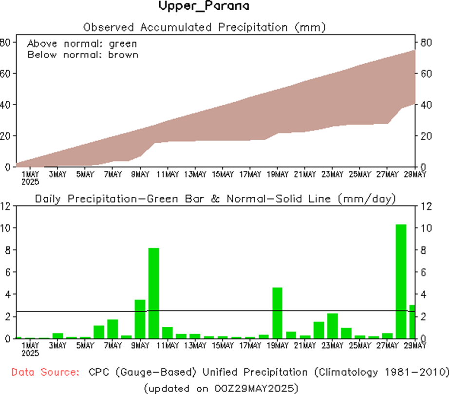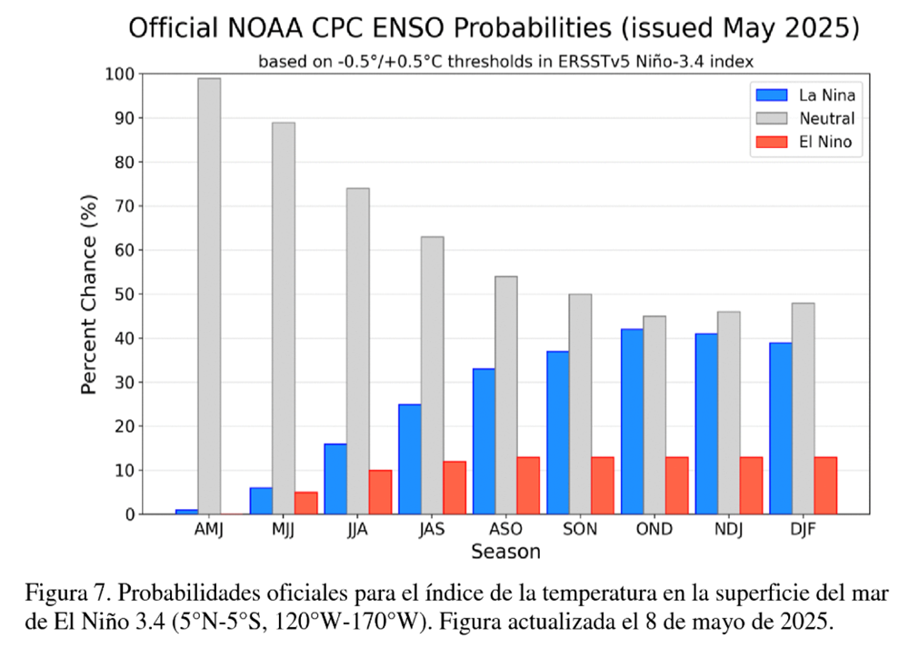 El fenómeno de El Niño-Oscilación del Sur (ENOS) es neutro. El último valor de Niño 3.4 para la semana que finalizó el 18 de mayo fue de -0,01 °C. Los valores neutros de ENOS se encuentran entre -0,8 °C y +0,8 °C.