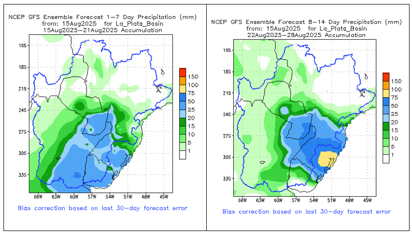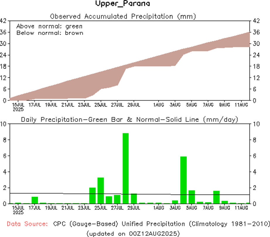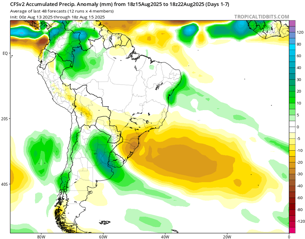 El fenómeno de El Niño-Oscilación del Sur (ENOS) se mantiene neutral. El último valor de El Niño 3.4 para la semana que finalizó el 10 de agosto es de -0,12 °C. Los valores neutrales de El Niño 3.4 se encuentran entre -0,8 °C y +0,8 °C.