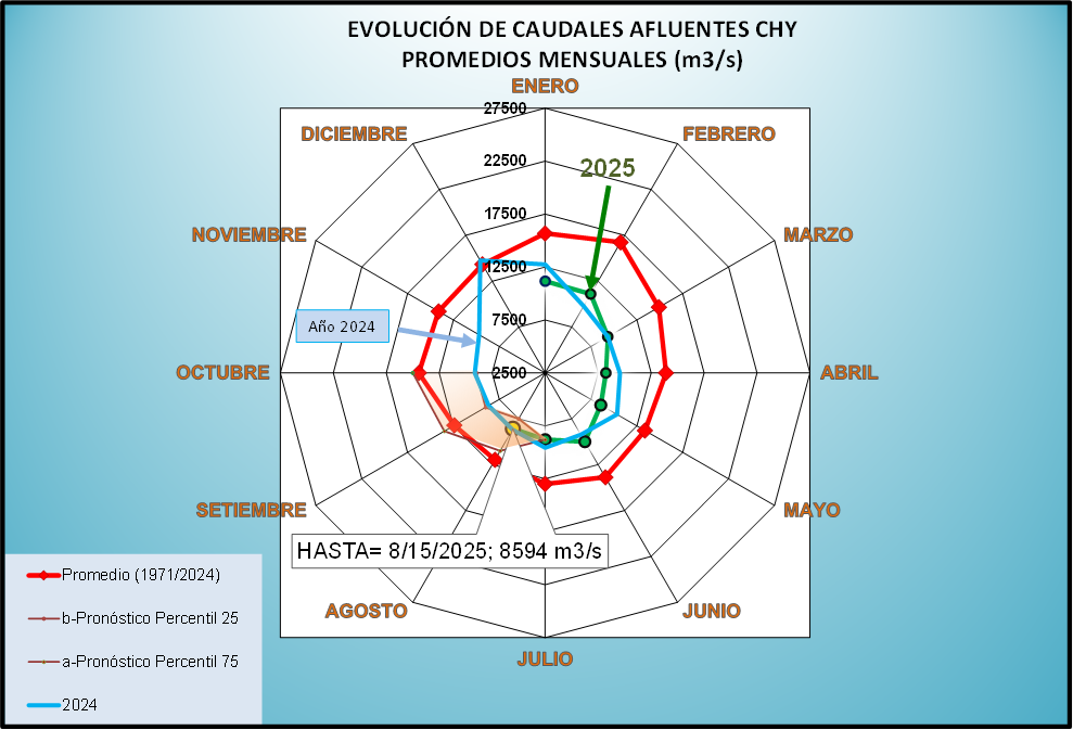 El caudal afluente a la CHY diario, pronosticado para la fecha de hoy es de 8.100 m3/s, y para el día de mañana se espera una afluencia del orden de 7.600 m3/s.