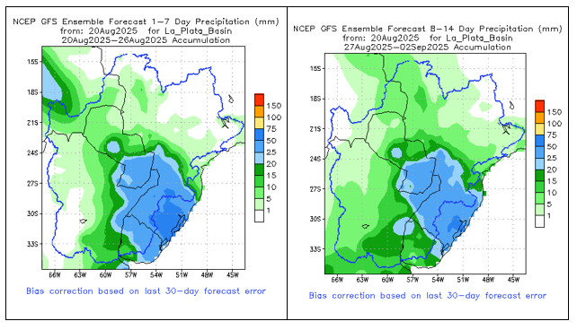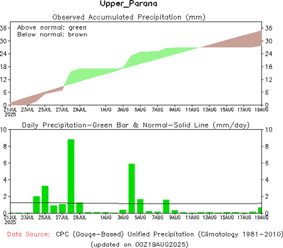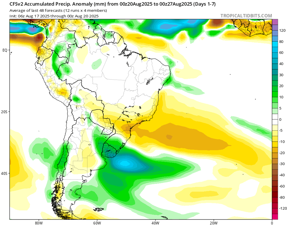 El fenómeno de El Niño-Oscilación del Sur (ENOS) se mantiene neutral. El último valor de El Niño 3.4 para la semana que finalizó el 10 de agosto es de -0,12 °C. Los valores neutrales de El Niño 3.4 se encuentran entre -0,8 °C y +0,8 °C.