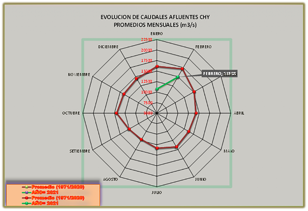 El caudal afluente a la CHY diario, pronosticado para la fecha de hoy es de 11.300 m3/s, y para el día de mañana se espera una afluencia del orden de 12.400 m3/s.