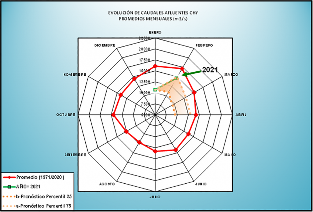 El caudal afluente a la CHY diario, pronosticado para la fecha de hoy es de 12.700 m3/s, y para el día de mañana se espera una afluencia del orden de 12.400 m3/s.