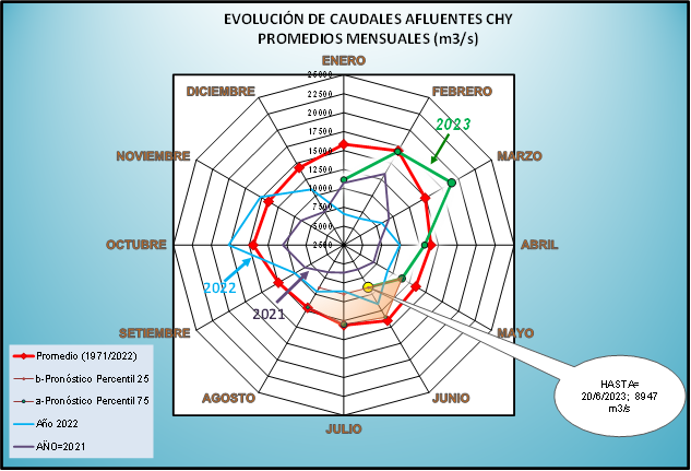 El caudal afluente a la CHY diario, pronosticado para la fecha de hoy es de 11.300 m3/s, y para el día de mañana se espera una afluencia del orden de 11.300 m3/s.