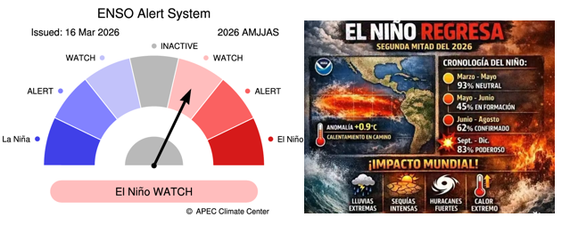 • El fenómeno de La Niña de 2025-2026 está llegando a su fin. Las temperaturas de la superficie del mar en el Pacífico tropical central han superado el umbral de La Niña (−0,80 °C) durante las últimas cuatro semanas, registrándose el último valor relativo del índice Niño3.4 para la semana que finalizó el 15 de marzo de 2026 en -0,53 °C. El calentamiento en las capas subsuperficiales sugiere que es probable que el fenómeno continúe disminuyendo en las próximas semanas.