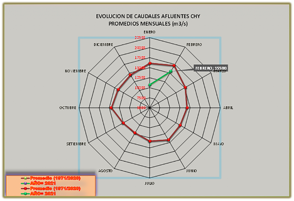 El caudal afluente a la CHY diario, pronosticado para la fecha de hoy es de 10.600 m3/s, y para el día de mañana se espera una afluencia del orden de 11.200 m3/s.