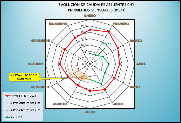 Para el pronóstico hidrológico se considera la programación energética y las previsiones de caudales afluentes (medias diarias) que son realizadas teniendo en cuenta las condiciones actuales y pronósticos disponibles, que además están sujetas a revisión en función de eventuales cambios en las condiciones hidrometeorológicas (además de fenómenos localizados como el viento que se traduce en oleaje) y de las descargas de las Centrales Hidroeléctricas aguas arriba de la CHY.