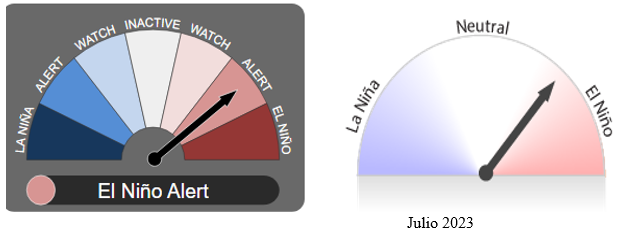 La Perspectiva ENSO está en Alerta El Niño. Cuando los criterios de Alerta de El Niño se han cumplido en el pasado, un evento de El Niño se ha desarrollado alrededor del 70% del tiempo.