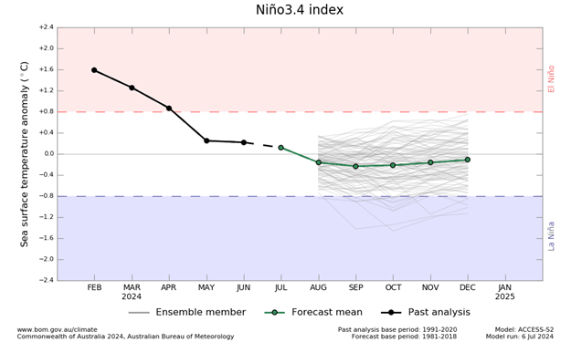 La Perspectiva ENSO se encuentra actualmente en ‘Vigilancia de La Niña’, lo que significa que hay algunas señales de que La Niña podría formarse en el Océano Pacífico más adelante en 2024. Los indicadores atmosféricos y oceánicos se encuentran actualmente dentro de los umbrales neutrales de ENSO.