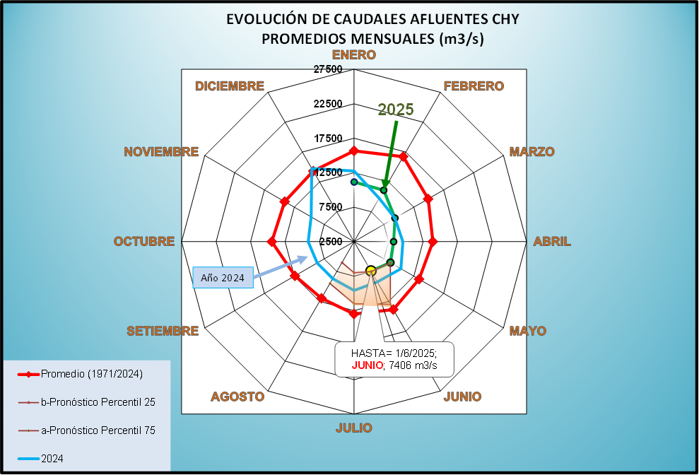 El caudal afluente a la CHY diario, pronosticado para la fecha de hoy es de 7.000 m3/s, y para el día de mañana se espera una afluencia del orden de 7.500 m3/s.