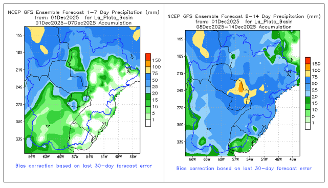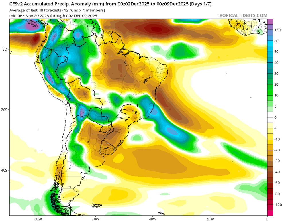 • El índice del Modo Anular del Sur (SAM) se mantiene neutral al 21 de noviembre de 2025. Se prevé que se torne negativo durante la próxima semana. Sin embargo, existe un amplio rango de posibles resultados, lo que indica una mayor incertidumbre hacia diciembre.