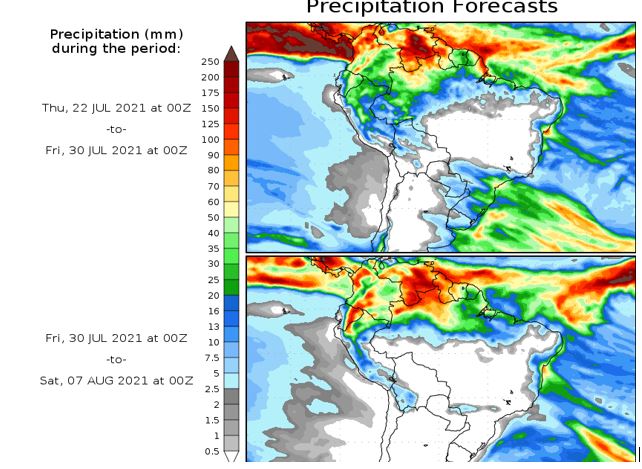 El pronóstico Hidrometeorológico del Centro Climático de referencia indica una tendencia semanal de poca significancia hidrológica en la cuenca de interés para la CHY con dispersión geográfica según sea la fuente consultada. (Ver gráfico Nro. 1).