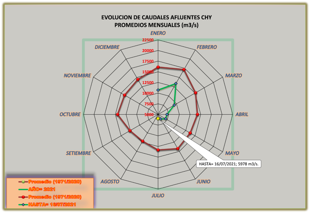 El caudal afluente a la CHY diario, pronosticado para la fecha de hoy es de 7.000 m3/s, y para el día de mañana se espera una afluencia del orden de 6.600 m3/s.