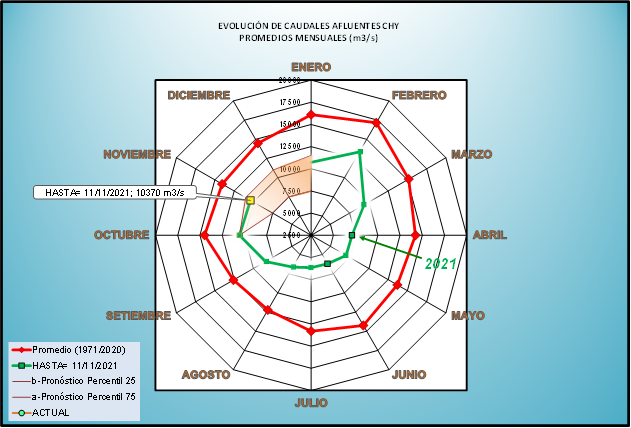 El caudal afluente a la CHY diario, pronosticado para la fecha de hoy es de 8.200 m3/s, y para el día de mañana se espera una afluencia del orden de 8.100 m3/s.