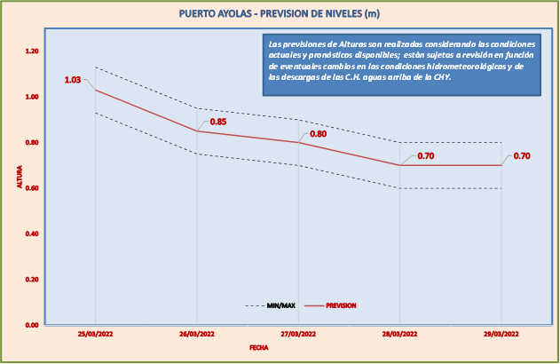 Las previsiones de Alturas son realizadas considerando las condiciones actuales y pronósticos disponibles y están sujetas a revisión en función de eventuales cambios en las condiciones hidrometeorológicas y de las descargas de las C.H. aguas arriba de la CHY.