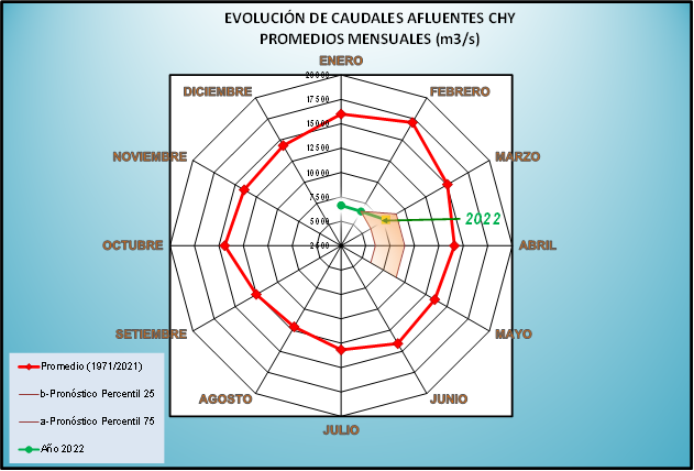 Para el pronóstico hidrológico se considera la programación energética y las previsiones de caudales afluentes (medias diarias) que son realizadas teniendo en cuenta las condiciones actuales y pronósticos disponibles, que además están sujetas a revisión en función de eventuales cambios en las condiciones hidrometeorológicas (además de fenómenos localizados como el viento que se traduce en oleaje) y de las descargas de las Centrales Hidroeléctricas aguas arriba de la CHY.