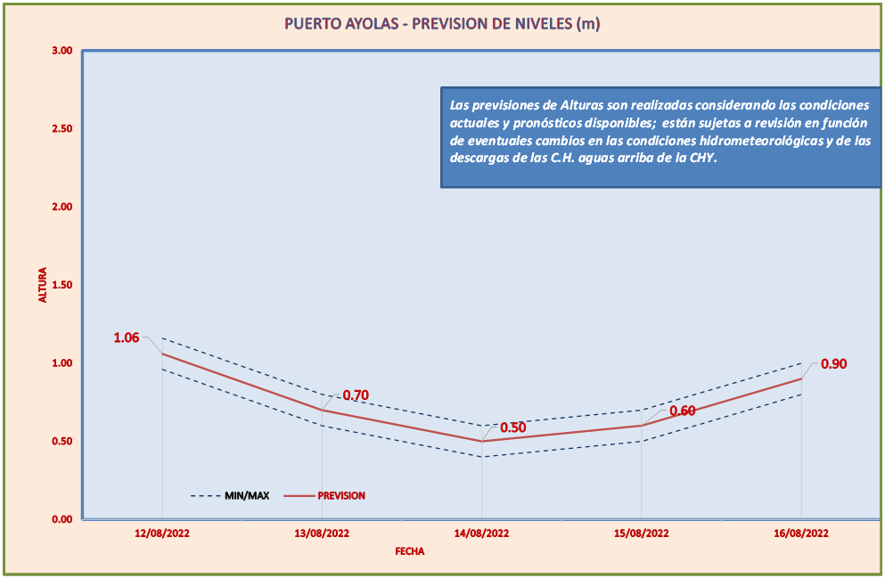 Las previsiones de Alturas son realizadas considerando las condiciones actuales y pronósticos disponibles y están sujetas a revisión en función de eventuales cambios en las condiciones hidrometeorológicas y de las descargas de las C.H. aguas arriba de la CHY.