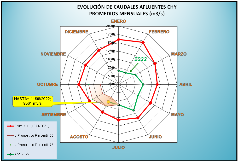 El caudal afluente a la CHY diario, pronosticado para la fecha de hoy es de 10.200 m3/s, y para el día de mañana se espera una afluencia del orden de 9.200 m3/s.