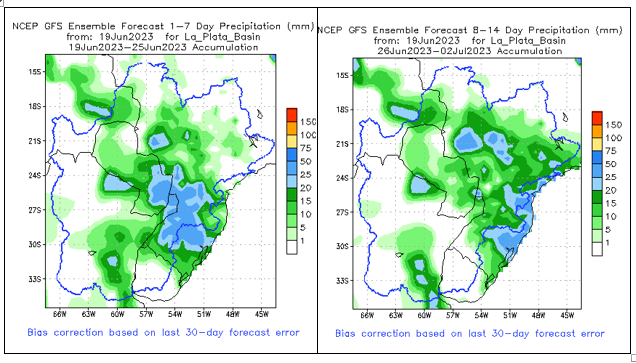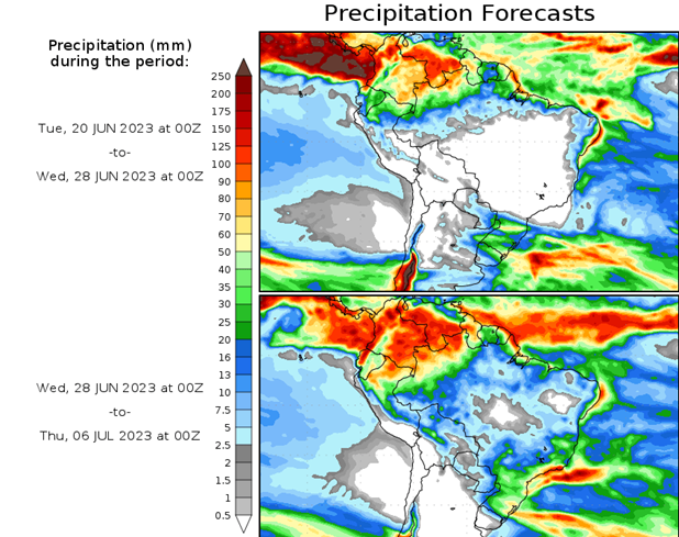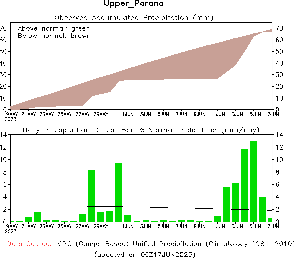 El pronóstico Hidrometeorológico del Centro Climático de referencia indica una tendencia semanal de poca significancia hidrológica en la cuenca de interés para la CHY con dispersión geográfica según sea la fuente consultada. (Ver gráfico Nro. 1).