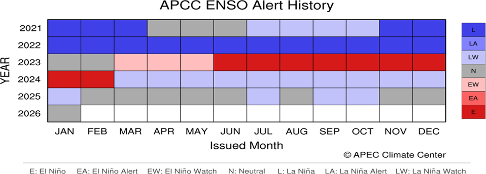 • Se espera que el dipolo del océano Índico (IOD) permanezca neutral al menos hasta finales del otoño de 2026. El IOD suele estar inactivo entre diciembre y abril.