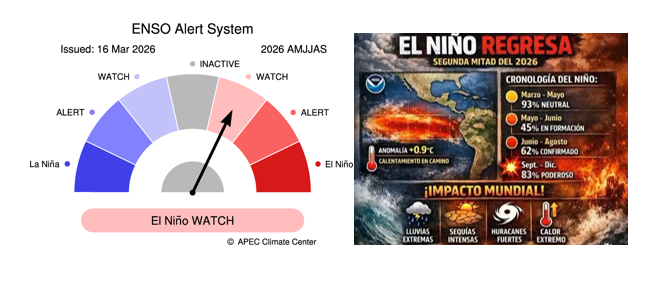 • El fenómeno de La Niña de 2025-2026 está llegando a su fin. Las temperaturas de la superficie del mar en el Pacífico tropical central han superado el umbral de La Niña (−0,80 °C) durante las últimas cuatro semanas, registrándose el último valor relativo del índice Niño3.4 para la semana que finalizó el 15 de marzo de 2026 en -0,53 °C. El calentamiento en las capas subsuperficiales sugiere que es probable que el fenómeno continúe disminuyendo en las próximas semanas.