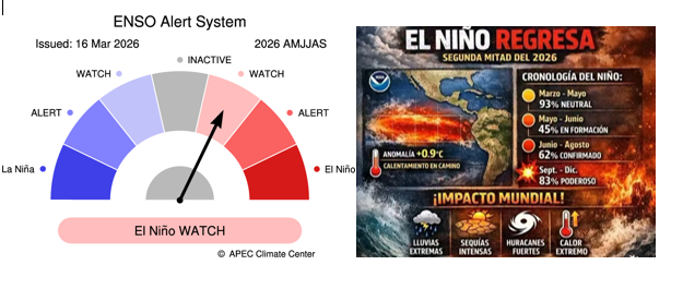 • El fenómeno de La Niña de 2025-2026 está llegando a su fin. Las temperaturas de la superficie del mar en el Pacífico tropical central han superado el umbral de La Niña (−0,80 °C) durante las últimas cuatro semanas, registrándose el último valor relativo del índice Niño3.4 para la semana que finalizó el 15 de marzo de 2026 en -0,53 °C. El calentamiento en las capas subsuperficiales sugiere que es probable que el fenómeno continúe disminuyendo en las próximas semanas.