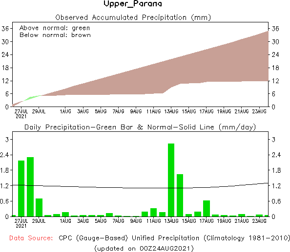 Los embalses de acumulación del Brasil que se ubican en la cuenca alta del río Paraná, aguas arriba de la Central Hidroeléctrica de Yacyretá, se encuentran con volúmenes útiles y niveles muy por debajo de lo normal debido a las escasas precipitaciones registradas.