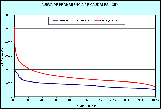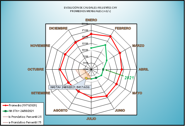 El caudal afluente a la CHY diario, pronosticado para la fecha de hoy es de 7.700 m3/s, y para el día de mañana se espera una afluencia del orden de 7.700 m3/s.