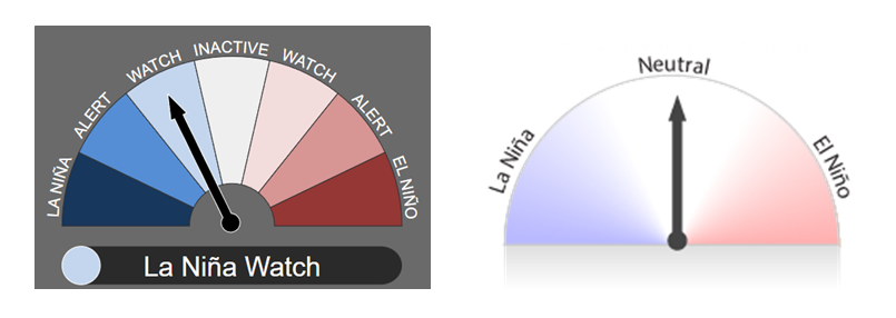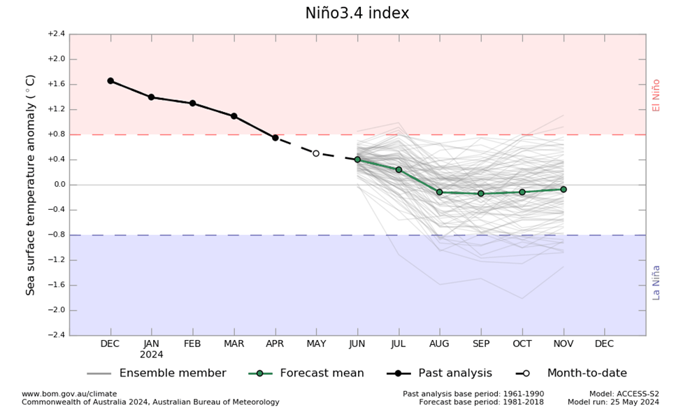 La Perspectiva ENSO se encuentra actualmente en ‘Vigilancia de La Niña’, lo que significa que hay algunas señales de que La Niña podría formarse en el Océano Pacífico más adelante en 2024. Los indicadores atmosféricos y oceánicos se encuentran actualmente dentro de los umbrales neutrales de ENSO.
