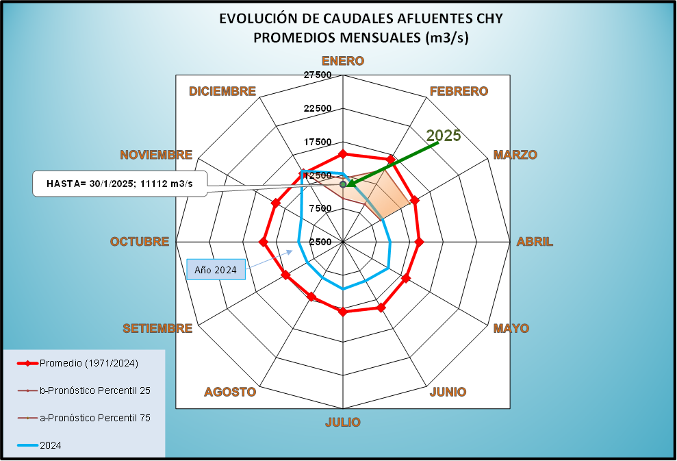 El caudal afluente a la CHY diario, pronosticado para la fecha de hoy es de 12.900 m3/s, y para el día de mañana se espera una afluencia del orden de 12.600 m3/s.