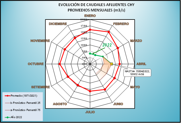 El caudal afluente a la CHY diario, pronosticado para la fecha de hoy es de 10.800 m3/s, y para el día de mañana se espera una afluencia del orden de 10.000 m3/s.