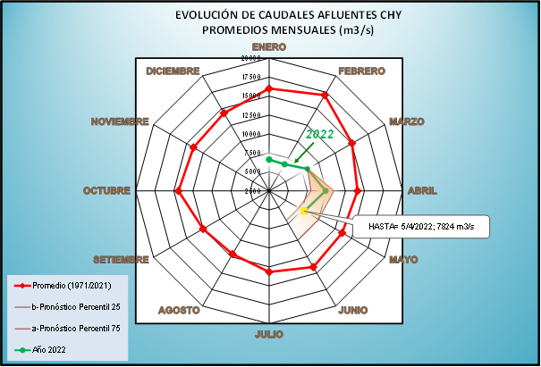 El caudal afluente a la CHY diario, pronosticado para la fecha de hoy es de 8.200 m3/s, y para el día de mañana se espera una afluencia del orden de 8.600 m3/s.