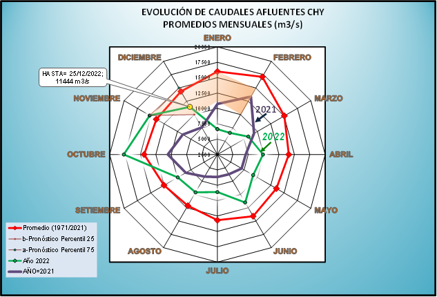 El caudal afluente a la CHY diario, pronosticado para la fecha de hoy es de 8.700 m3/s, y para el día de mañana se espera una afluencia del orden de 9.200 m3/s.