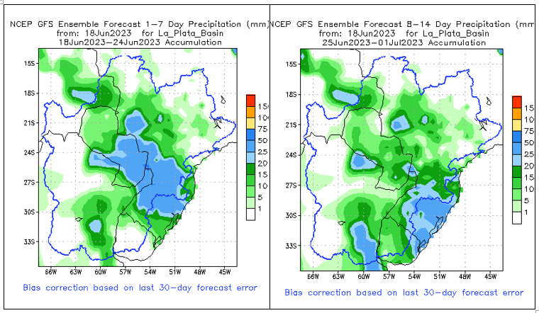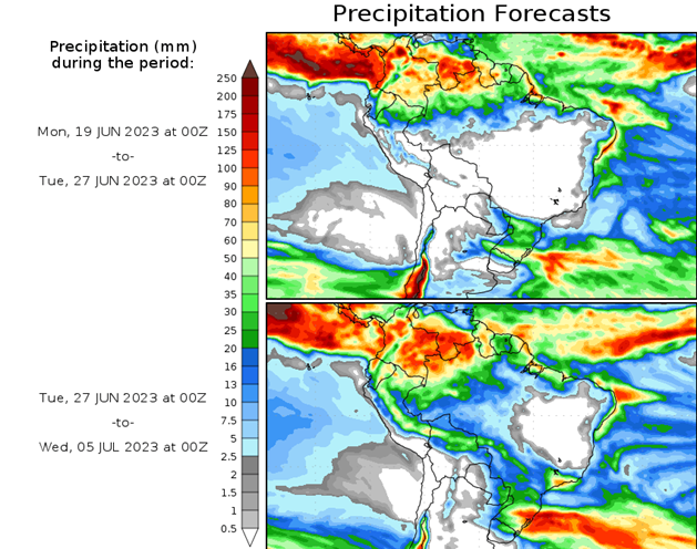 El pronóstico Hidrometeorológico del Centro Climático de referencia indica una tendencia semanal de poca significancia hidrológica en la cuenca de interés para la CHY con dispersión geográfica según sea la fuente consultada. (Ver gráfico Nro. 1).