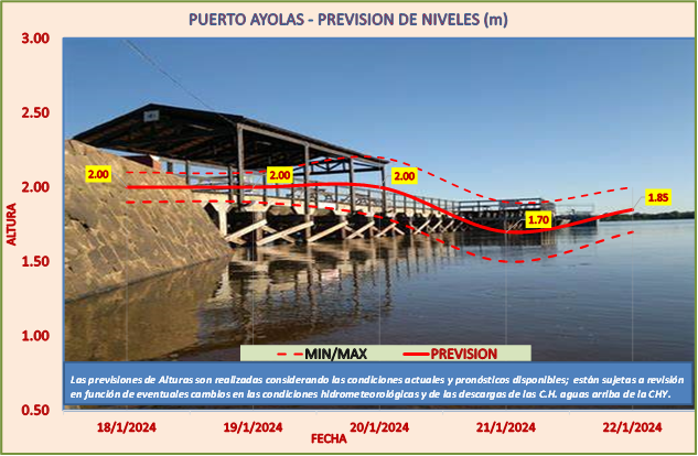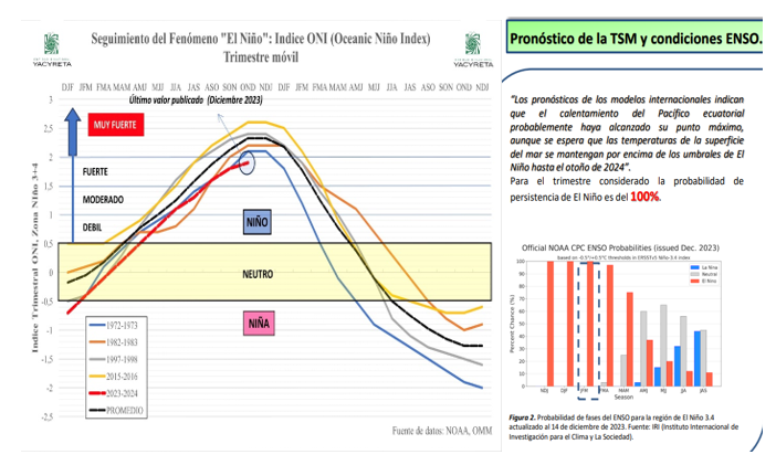 La evolución de índices climáticos publicados por organismos especializados de referencia, vinculados con la previsión del fenómeno caracterizado como “El Niño”, hace prever con un grado de probabilidad alto, que durante el periodo enero y marzo 2024 podrían verificarse eventos hidrológicos asociados a situaciones de aguas altas.