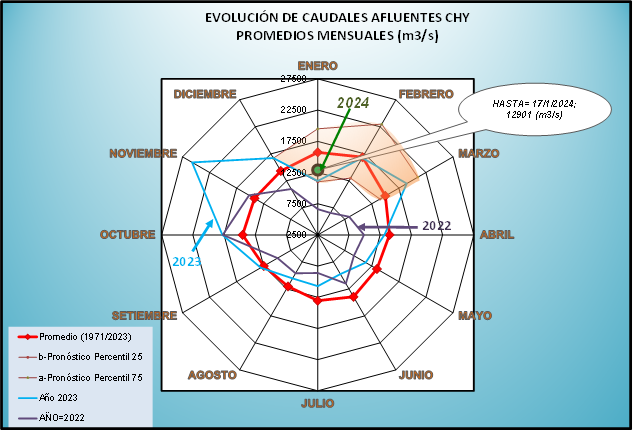 El caudal afluente a la CHY diario, pronosticado para la fecha de hoy es de 14.300 m3/s, y para el día de mañana se espera una afluencia del orden de 14.300 m3/s.