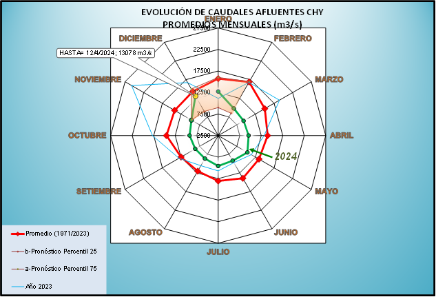 El caudal afluente a la CHY diario, pronosticado para la fecha de hoy es de 13.200 m3/s, y para el día de mañana se espera una afluencia del orden de 13.300 m3/s.