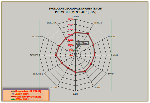 El caudal afluente a la CHY diario, pronosticado para la fecha de hoy es de 9.100 m3/s, y para el día de mañana se espera una afluencia del orden de 8.300 m3/s.