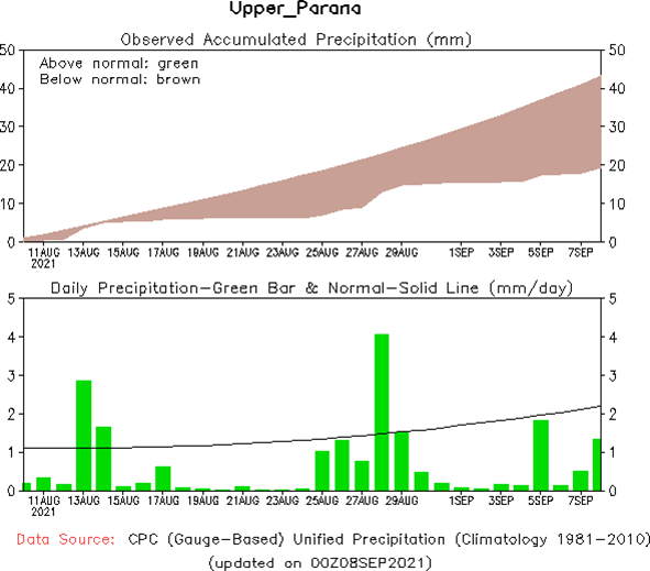 Los embalses de acumulación del Brasil que se ubican en la cuenca alta del río Paraná, aguas arriba de la Central Hidroeléctrica de Yacyretá, se encuentran con volúmenes útiles y niveles muy por debajo de lo normal debido a las escasas precipitaciones registradas.